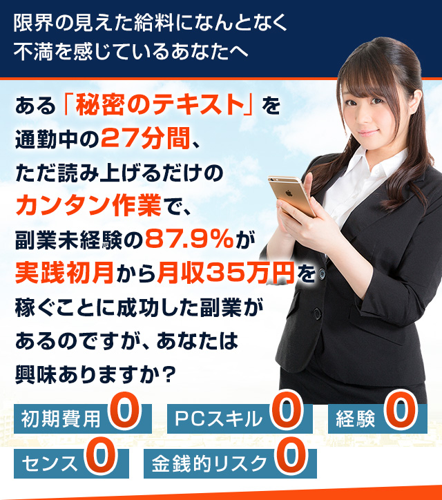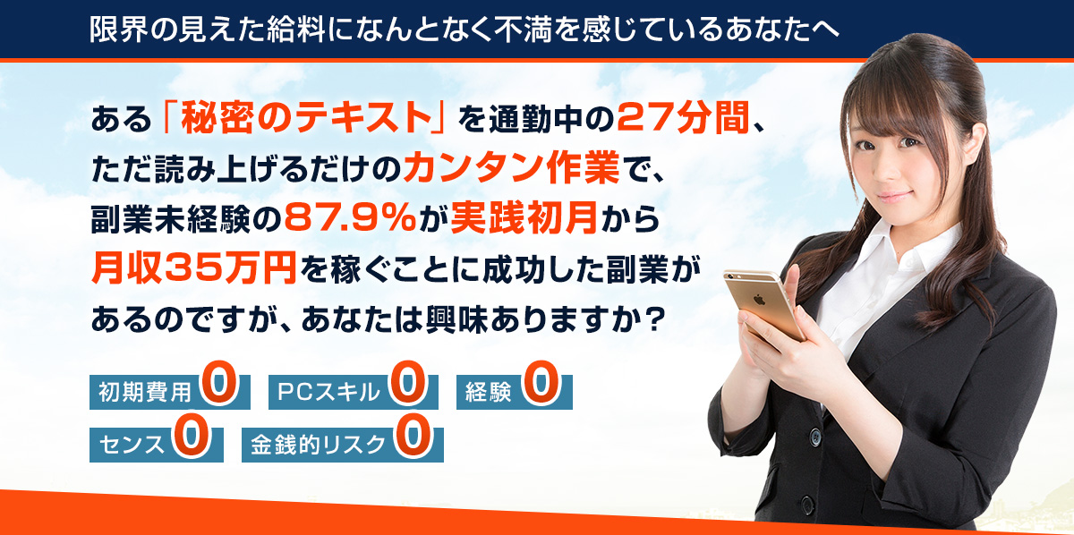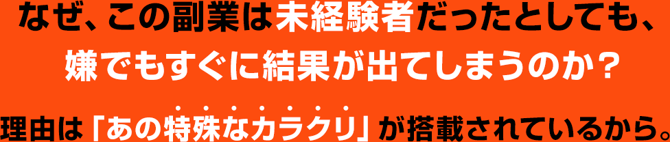 今まで交わる事が決してなかったビジネスモデルと儲けのカラクリを一体化させたことで誕生した初心者でも安心して取り組める、実績証明済みの副業ノウハウを、遂に解禁します。