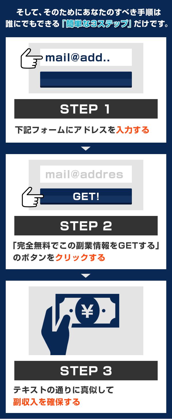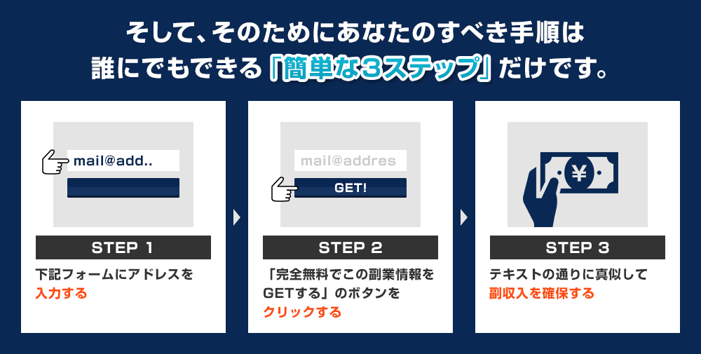 もしあなたが今の会社の給料に加えて、毎月安定した副収入を確保したい思いがあるのなら、今すぐ下記フォームにメールアドレスを入力してください。